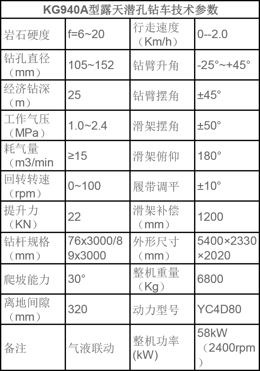 KG940A 型露天潛孔鉆車在KY140A 型履帶式露天潛孔鉆車的基礎上,對液壓系統、滑架部件、行走部件等進行優化升級,回轉轉速和推進速度更快,可靠性更好。