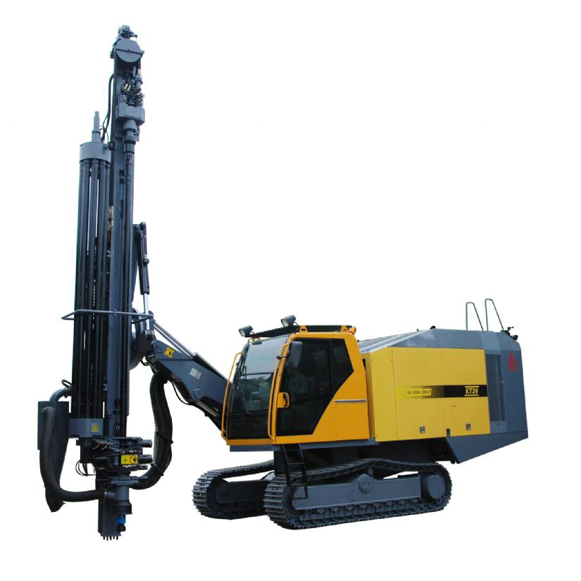 “開山”牌KT20型露天潛孔鉆車是開山集團(tuán)在多年開發(fā)生產(chǎn)潛孔鉆車的基礎(chǔ)上,針對(duì)大型露天礦山的需求,而精心設(shè)計(jì)的新型鑿巖設(shè)備。該鉆車行走、推進(jìn)、回轉(zhuǎn)及角度調(diào)整等動(dòng)作均采用液壓驅(qū)動(dòng),動(dòng)力強(qiáng)勁;配用高風(fēng)壓螺桿機(jī)頭及高風(fēng)壓氣動(dòng)沖擊器,鑿巖效率高;配有液壓干式集塵器收集粉塵,減少對(duì)環(huán)境的污染;并配有液壓機(jī)械手及鉆桿庫拆缷鉆桿、浮動(dòng)接頭保護(hù)鉆桿螺紋,一個(gè)人即可拆缷鉆桿;空調(diào)駕駛室提供舒適的工作環(huán)境及自動(dòng)控制防卡閥減少卡鉆機(jī)率。鉆車具有整體性好、自動(dòng)化程度高、鑿巖效果好、環(huán)保節(jié)能、操作方便、機(jī)動(dòng)靈活、行駛安全等特點(diǎn)。