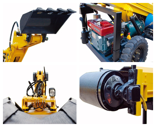 該機器動力源為外部引入380V三相交流電源電動機與本機自帶柴油機結合。采用一臺主電機和一臺電動滾筒為主工作動力,柴油機動力方便機器移位等。功能包括行走、挖掘采集、輸送、裝車、清底等功能。其中行走由液壓馬達驅動,具有前行、后退和自動剎車功能,挖掘采集由機械手執行,通過液壓操作控制機械手上下左右回轉完成挖掘、采集、裝料、卸料。由電動滾筒帶動皮帶進行輸送,裝車時輸送機由兩根液壓油缸頂升并鎖定油缸作為支點進行裝卸作業 。